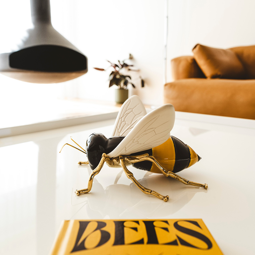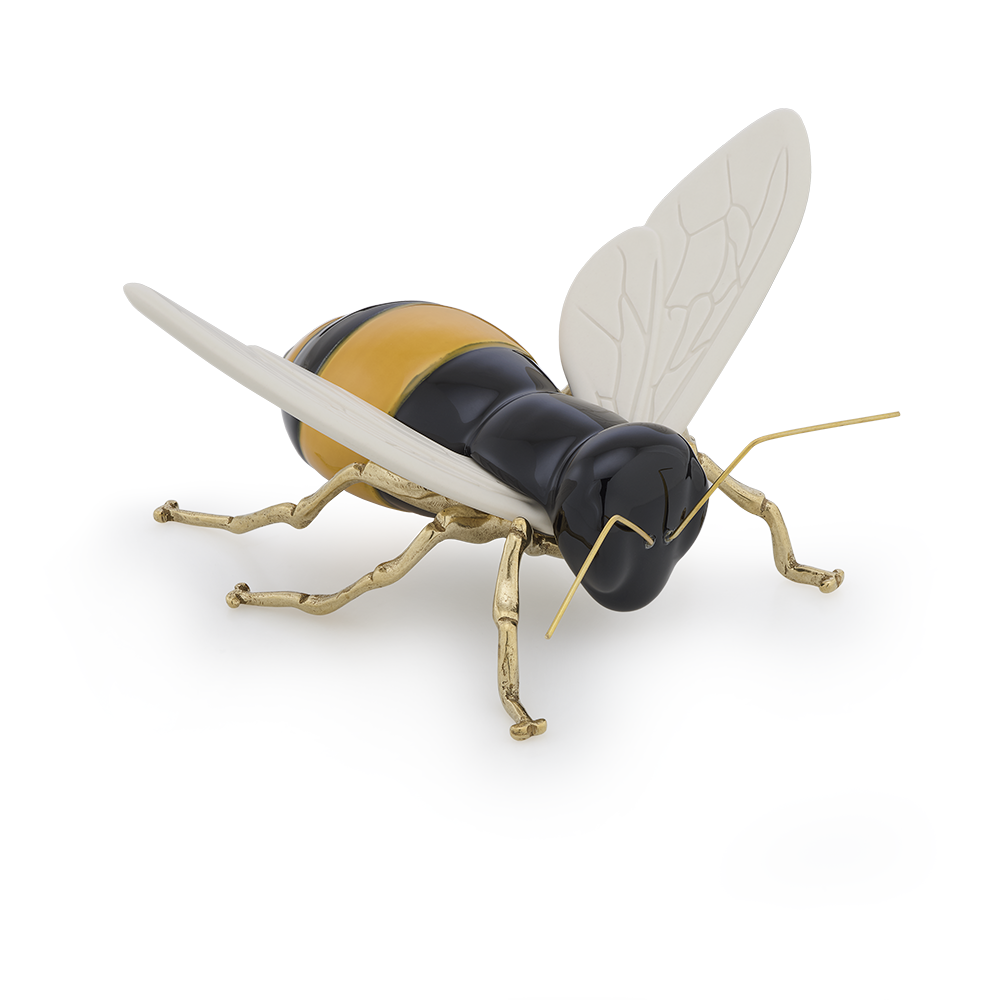 A abelha é uma representação de uma observação própria, em faiança, vidrada segundo a tradicional técnica manual de mergulho. Esta peça é enobrecida por patas em latão natural ou envelhecido, fundidas manualmente em molde de areia.