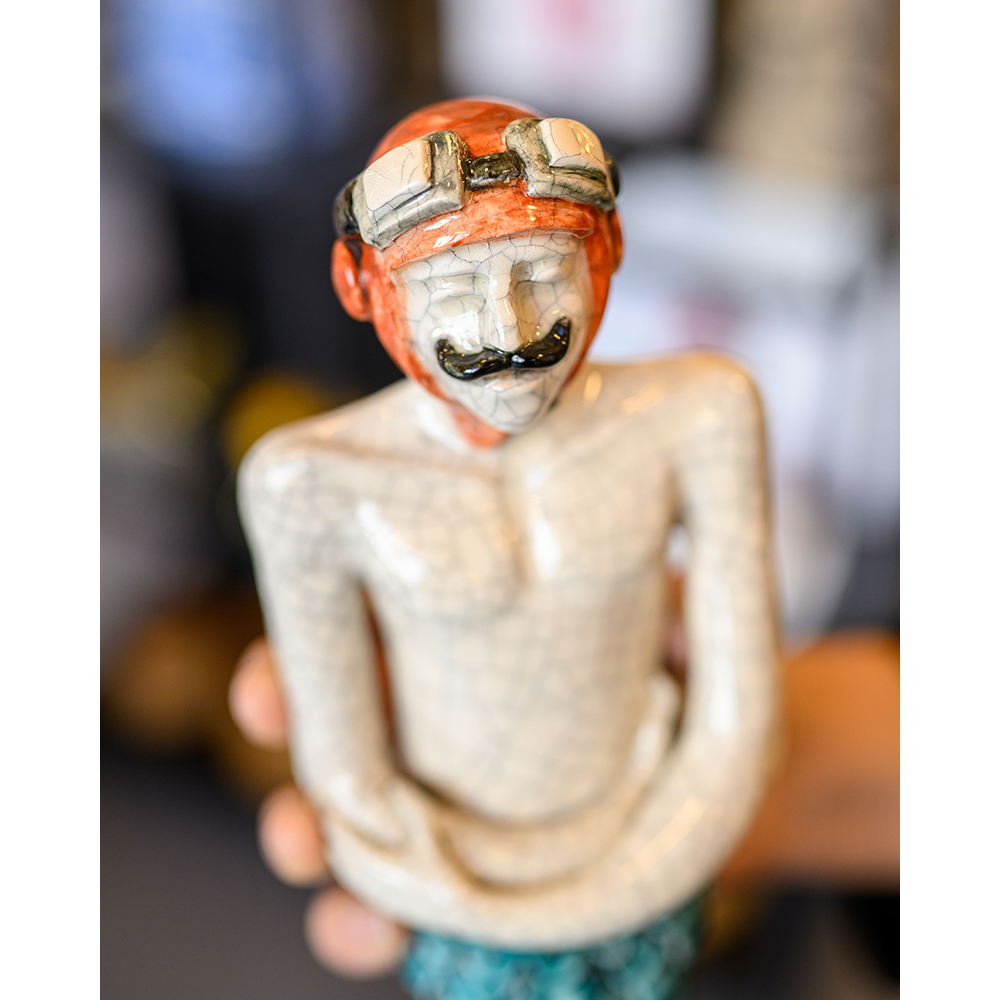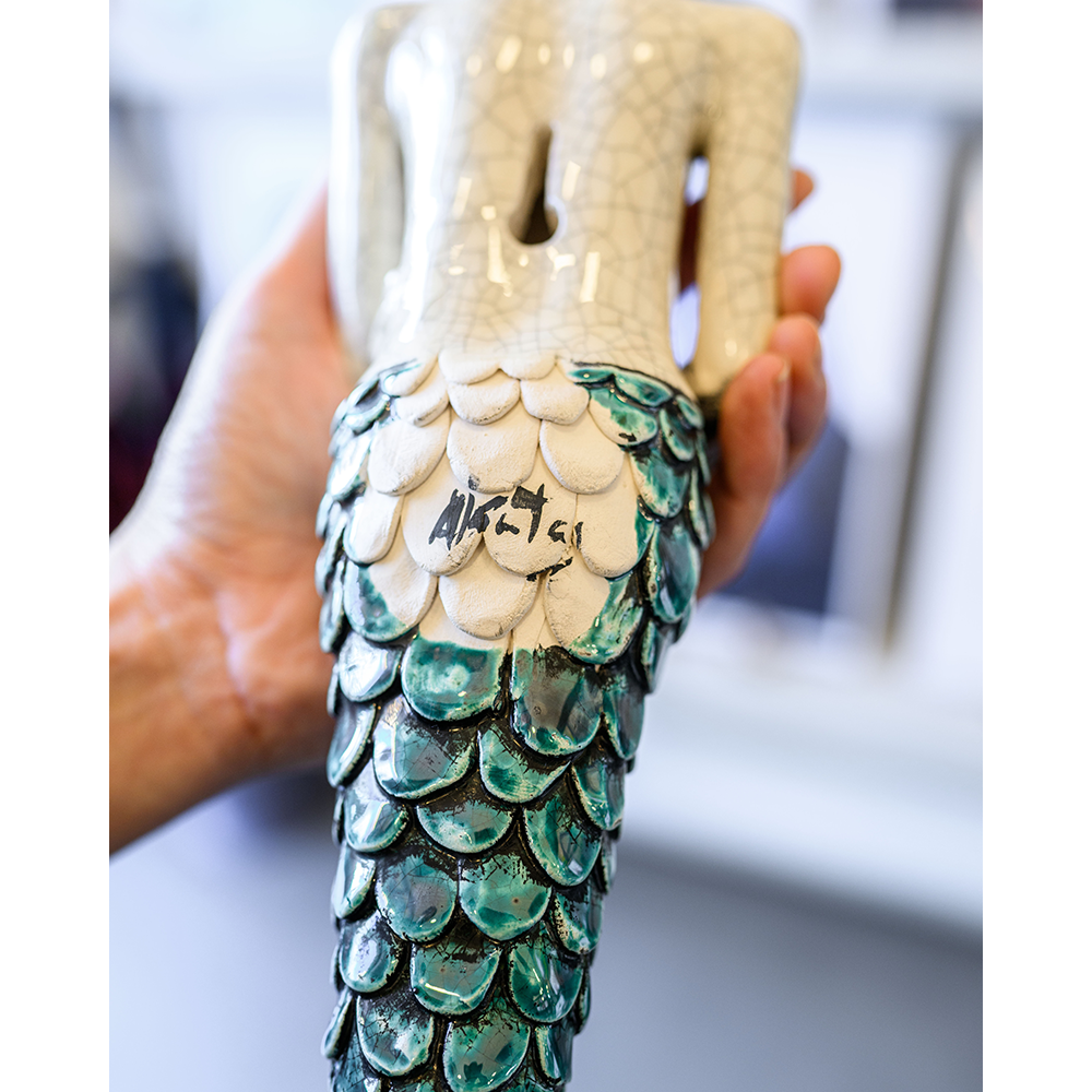 Cada detalhe foi cuidadosamente trabalhado revelando a singularidade de um processo artesanal autêntico. Não existem duas iguais — esta gente com escamas é ideal para colecionadores de arte, amantes do mar ou para quem procura uma peça especial para decorar com significado.