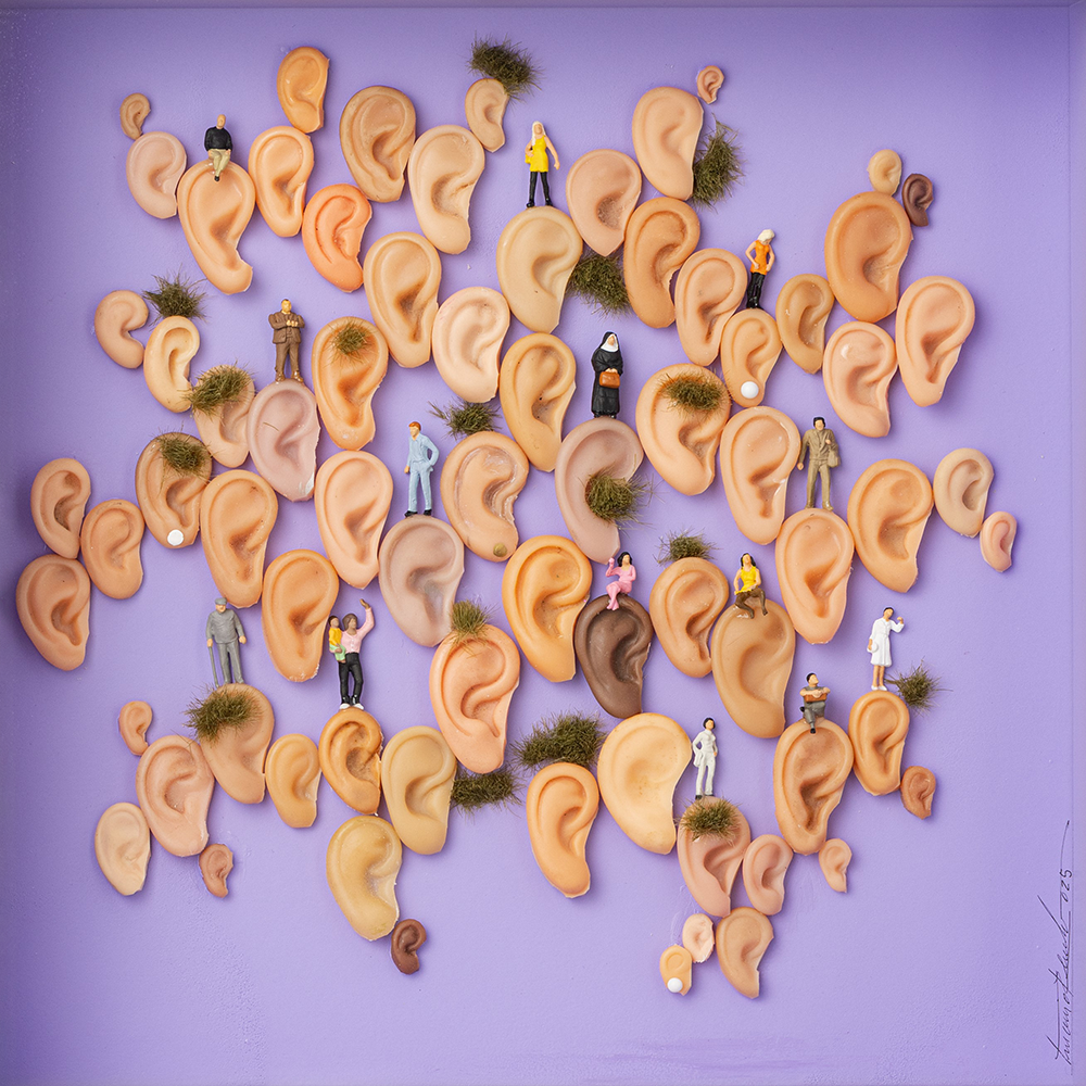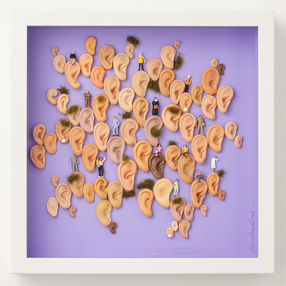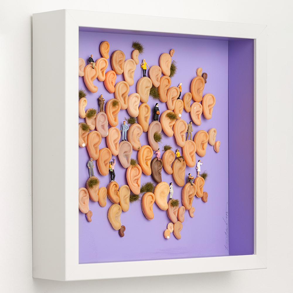 Peça única criada a partir da assemblagem de vários materiais, onde miniaturas ganham vida em cenários poéticos e inesperados.
