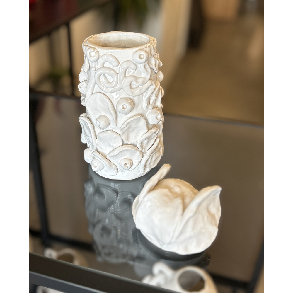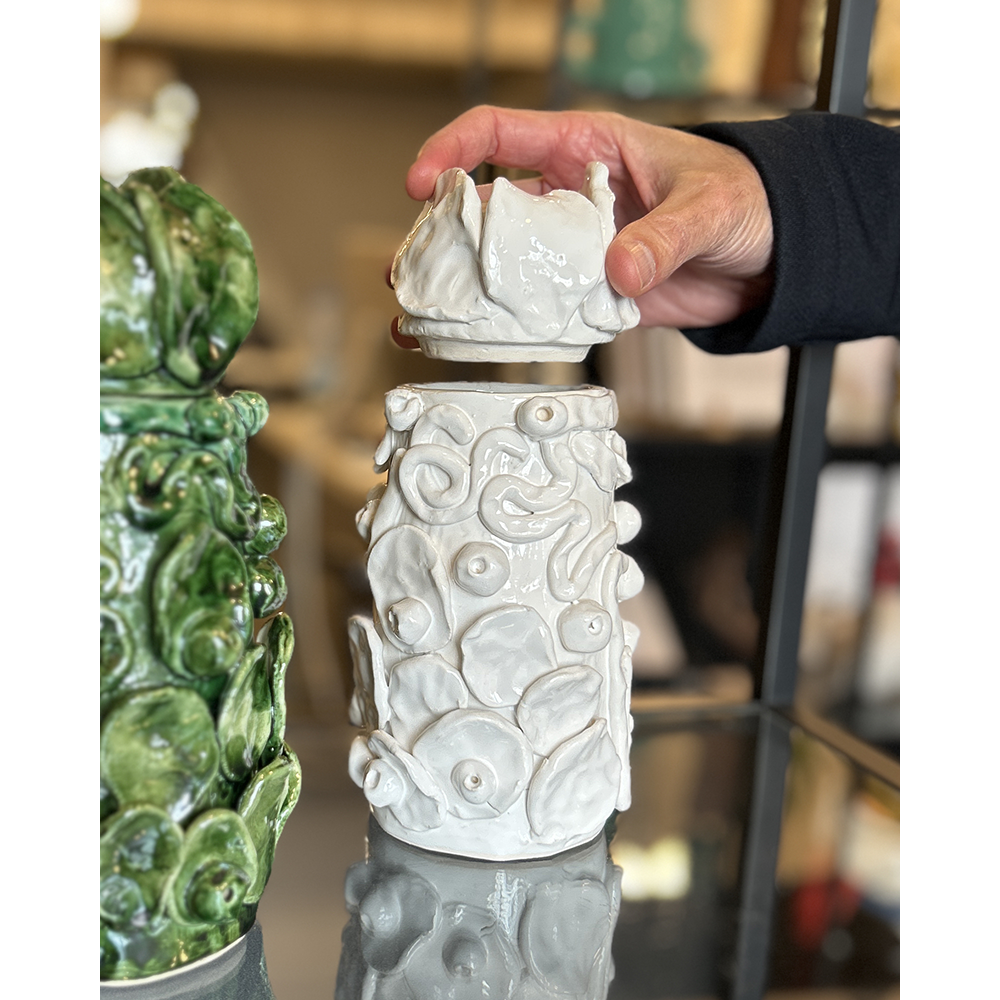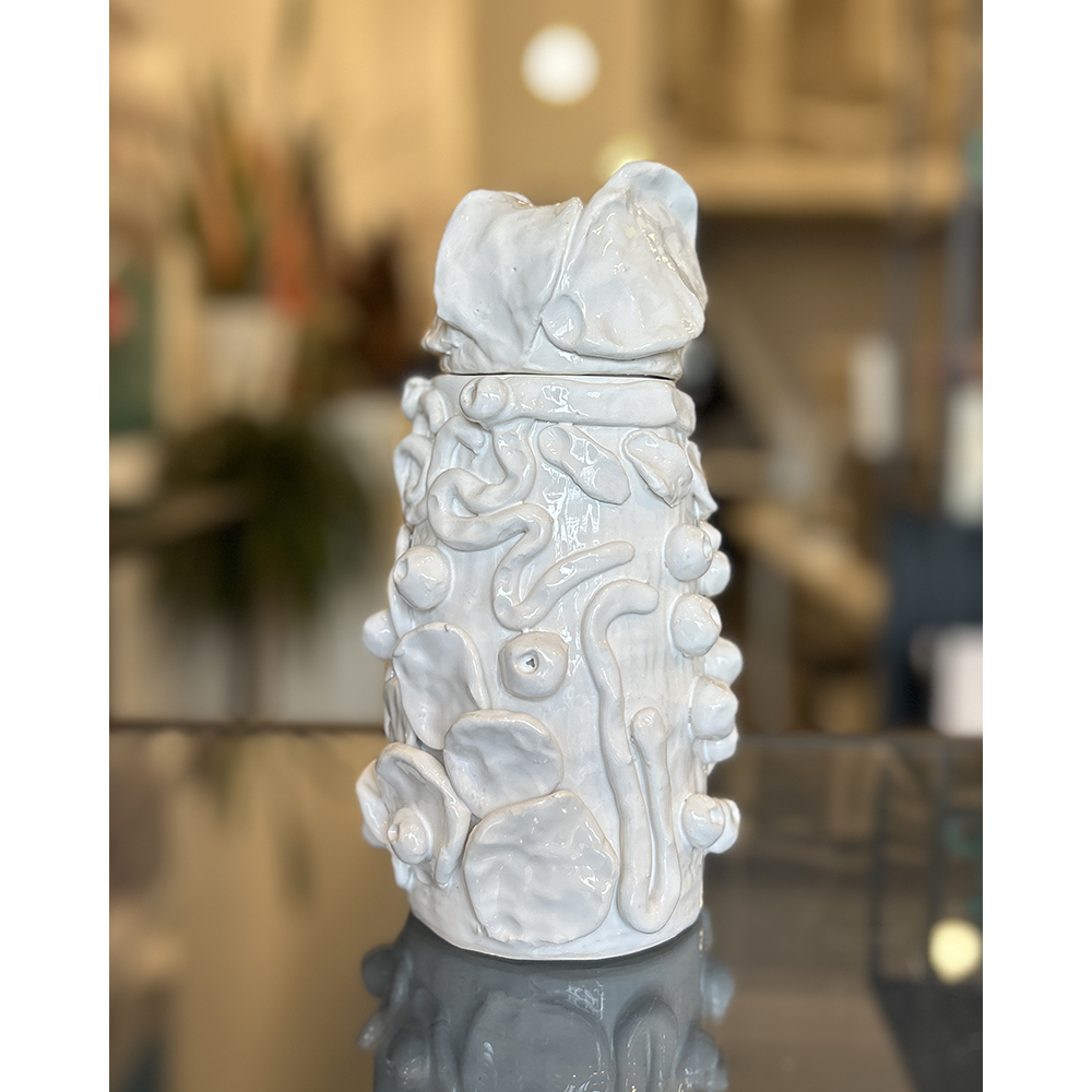 Jarra com tampa, modelada manualmente em grés com vidrado branco, onde a superfície é totalmente ocupada por elementos em relevo. A peça conjuga texturas, padrões geométricos e fragmentos escultóricos que se sobrepõem como camadas. As formas são aplicadas e esculpidas diretamente no corpo da peça.